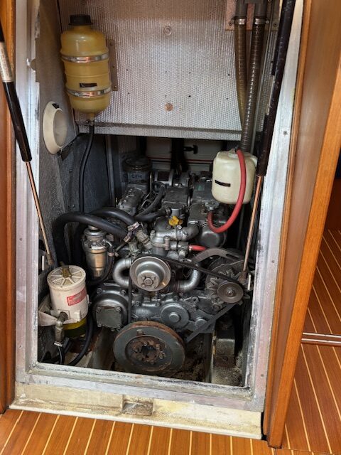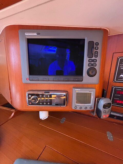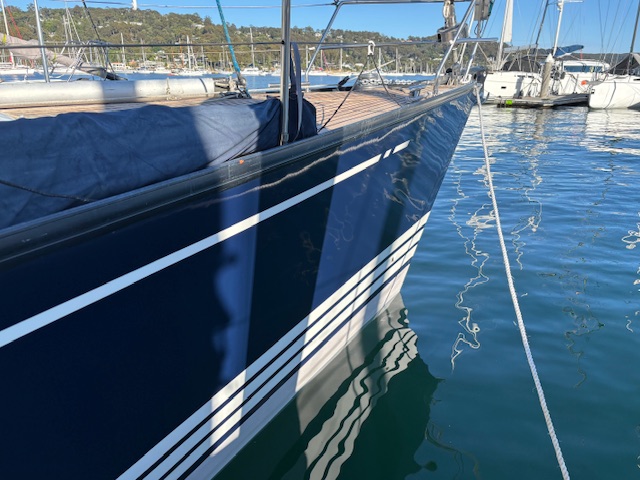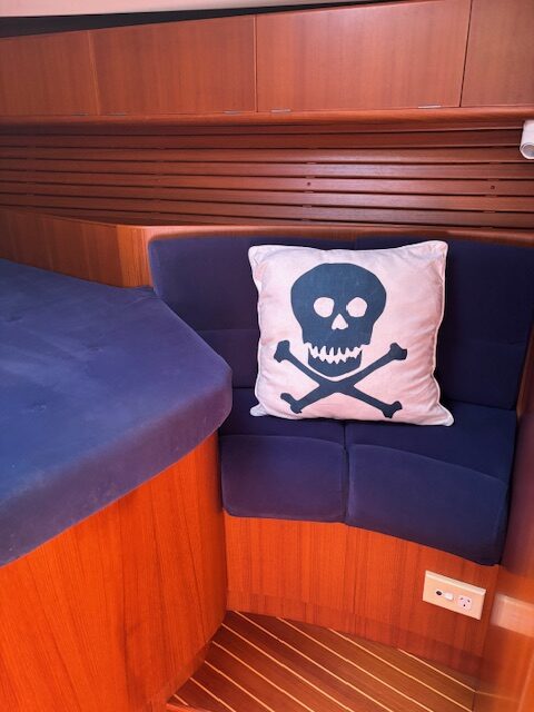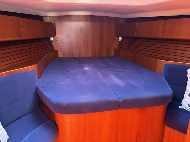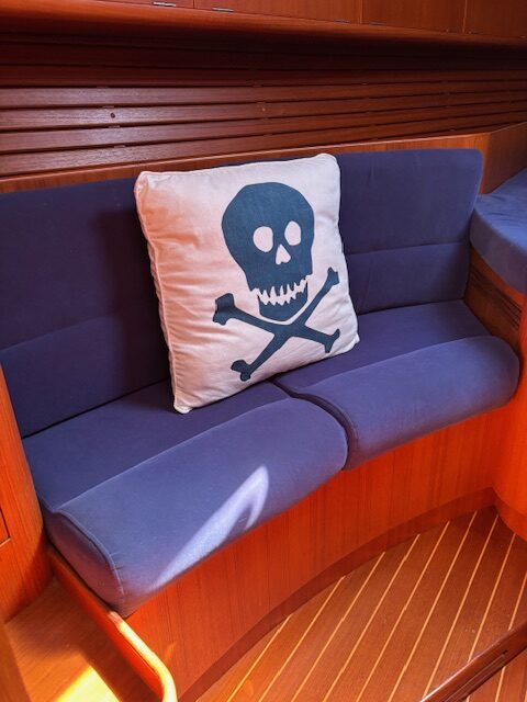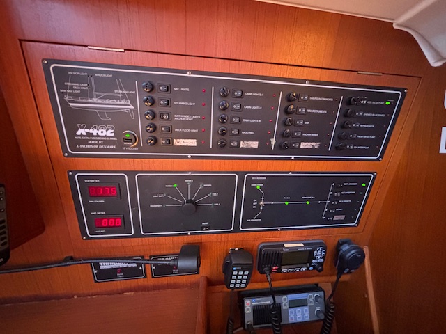 Gaia has a navy blue hull with the traditional three stripes of X-Yachts and a well maintained teak deck, a great set of sails, and all the options you can imagine including generator, lithium batteries, updated electronics, in boom furling and air conditioning