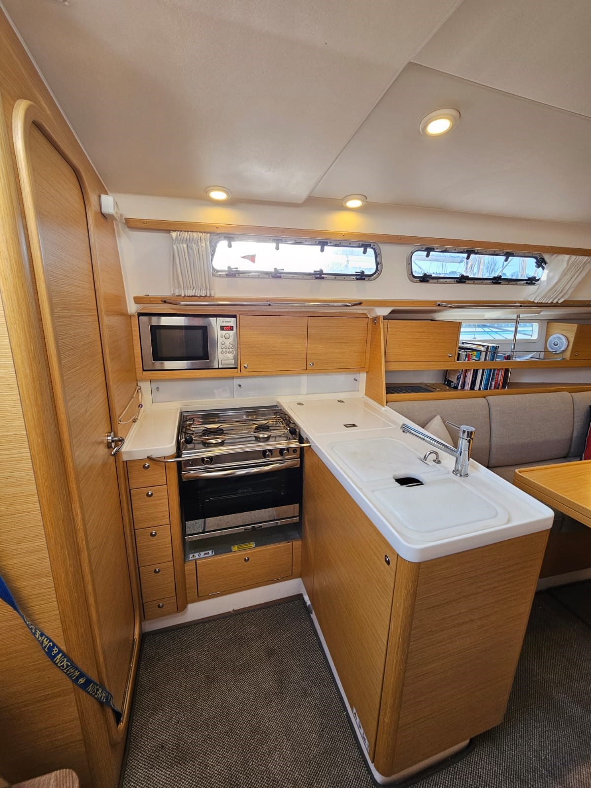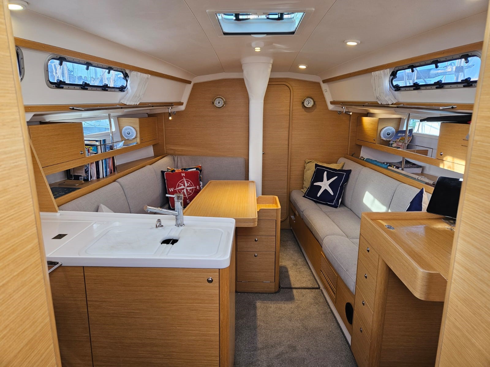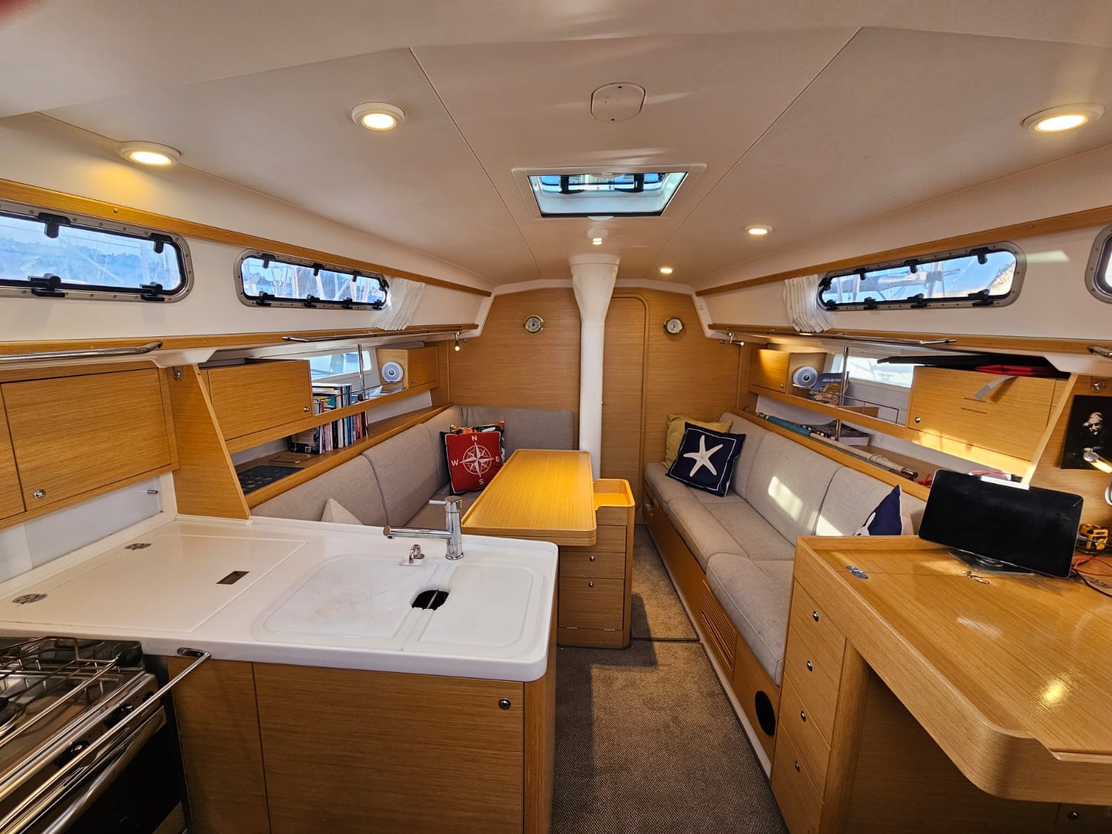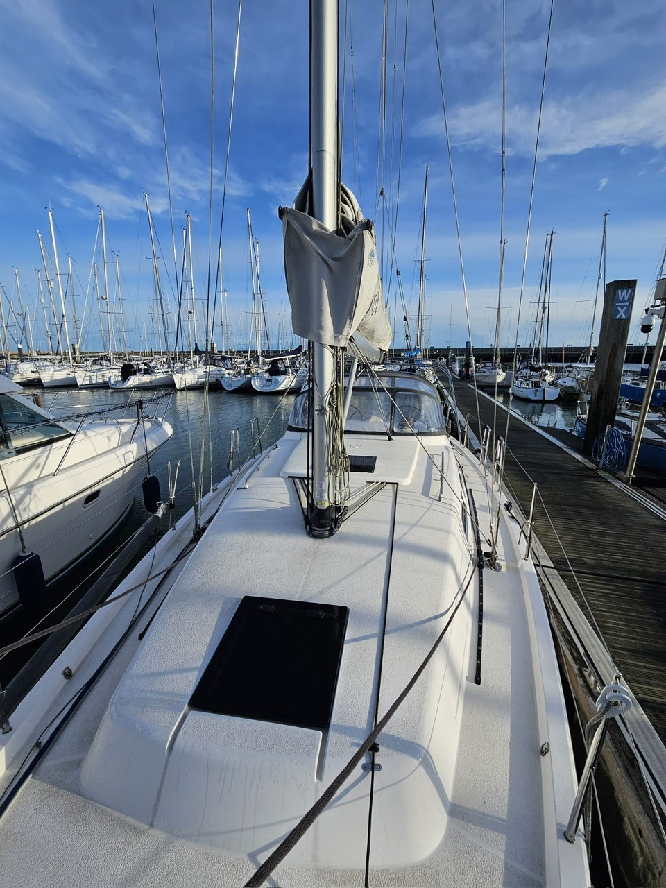 X-Yachts Irelandinfo@x-yachtsireland.comXc 35, build number #22, commissioned 2017. White hull with light grey hull stripes and 1.90m L-shaped keel. Standard aluminium mast with stackpack for mainsail. Teak on cockpit, and practical non-slip sidedecks and coachroof. Below decks she has two cabins, with one heads, classic layout with U-galley to port, and owner's berth forward.