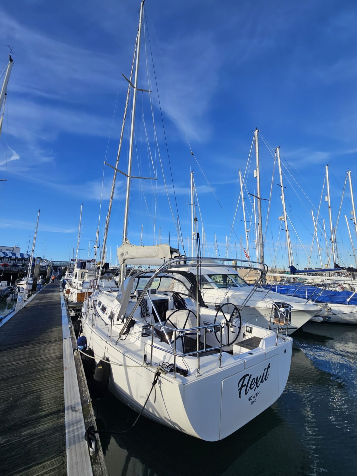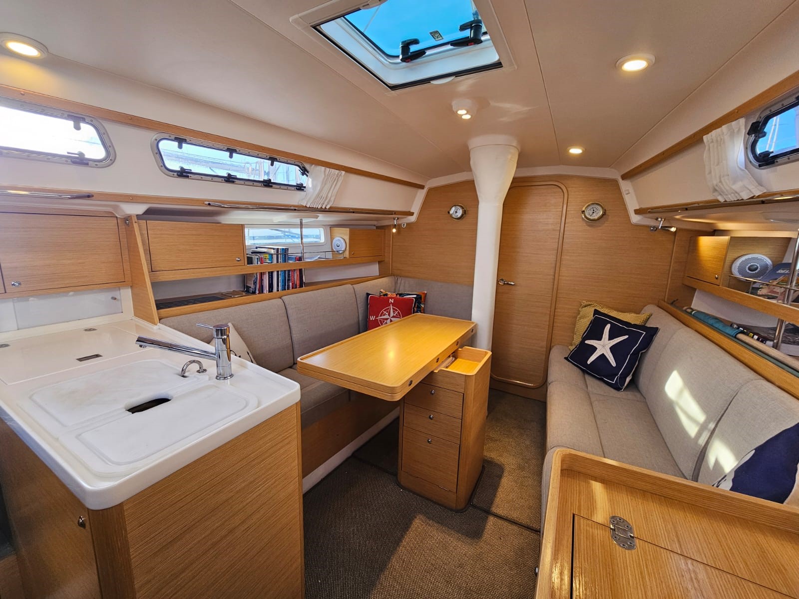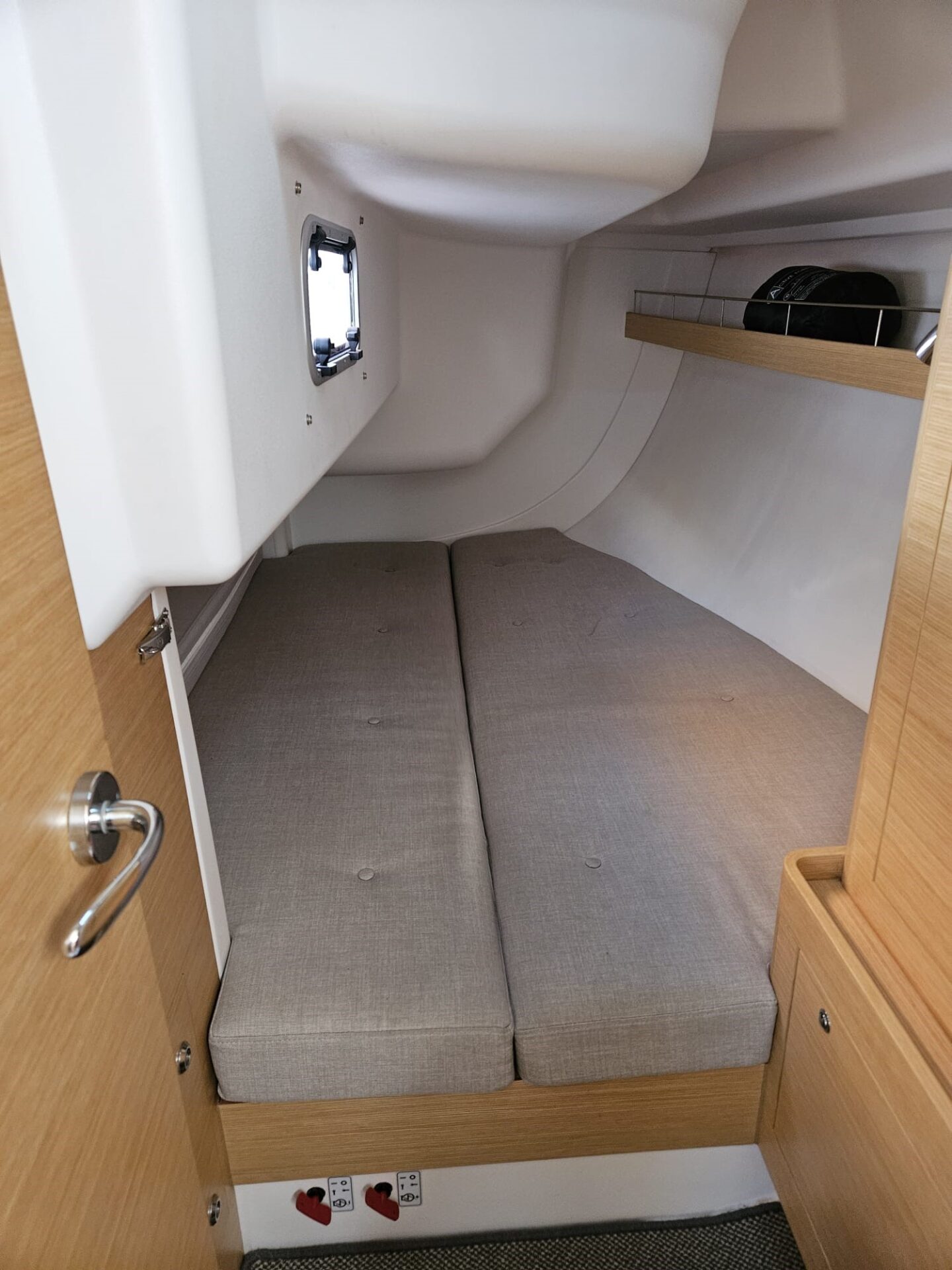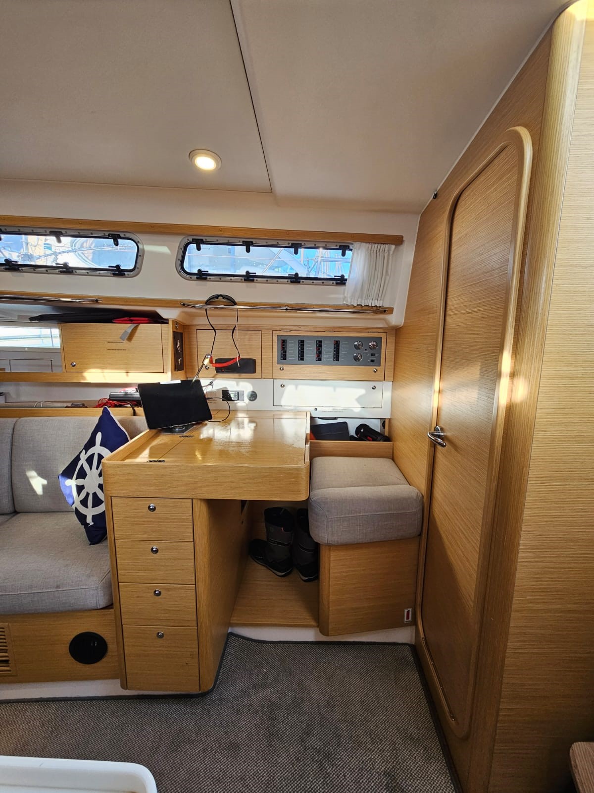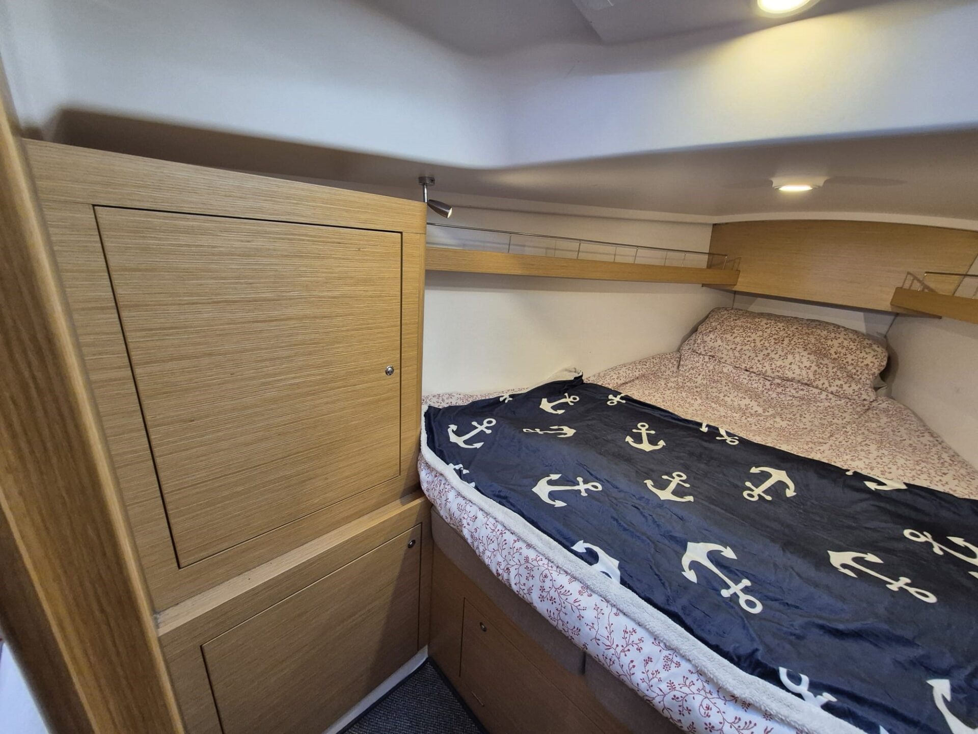 X-Yachts Irelandinfo@x-yachtsireland.comXc 35, build number #22, commissioned 2017. White hull with light grey hull stripes and 1.90m L-shaped keel. Standard aluminium mast with stackpack for mainsail. Teak on cockpit, and practical non-slip sidedecks and coachroof. Below decks she has two cabins, with one heads, classic layout with U-galley to port, and owner's berth forward.