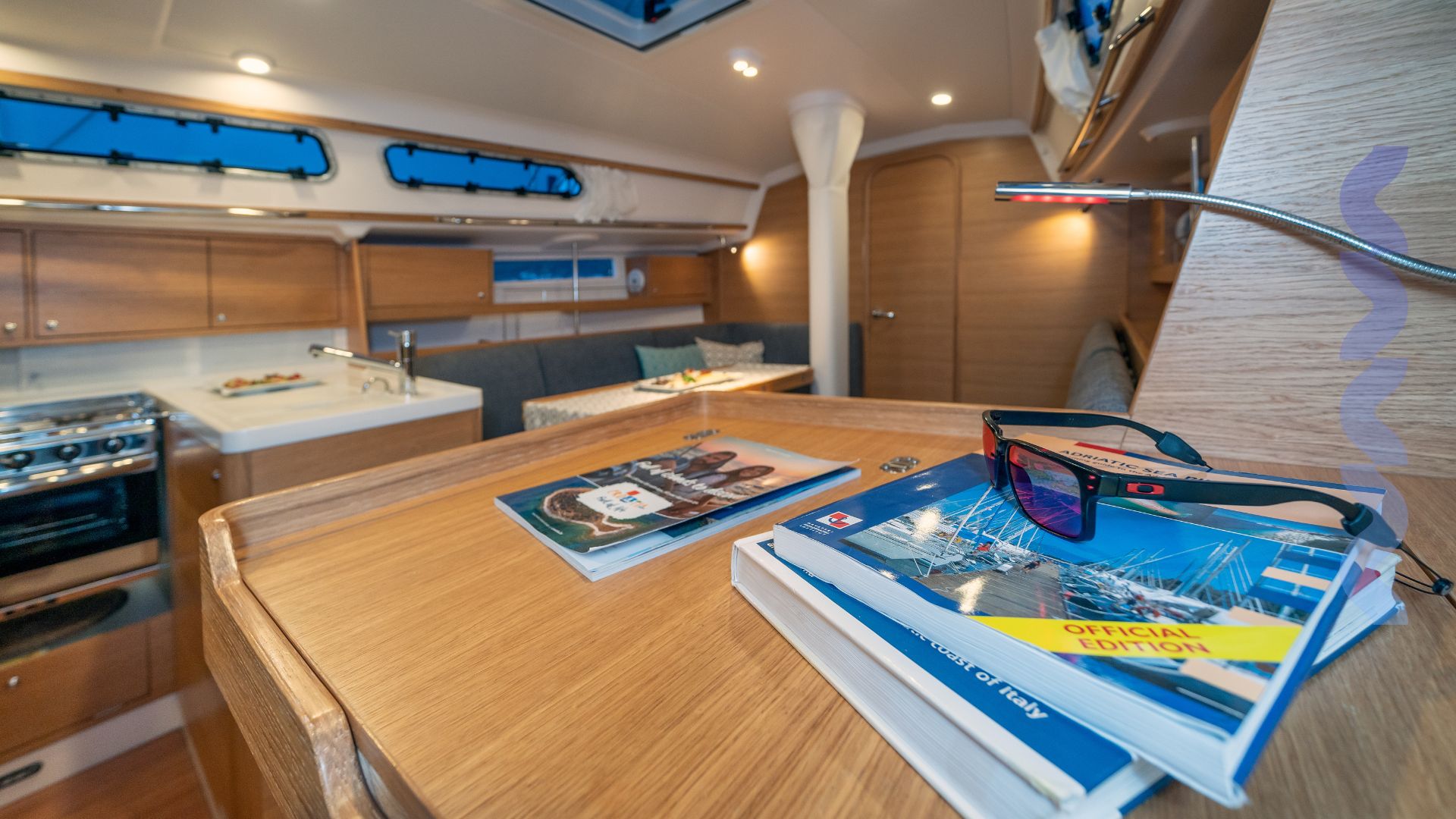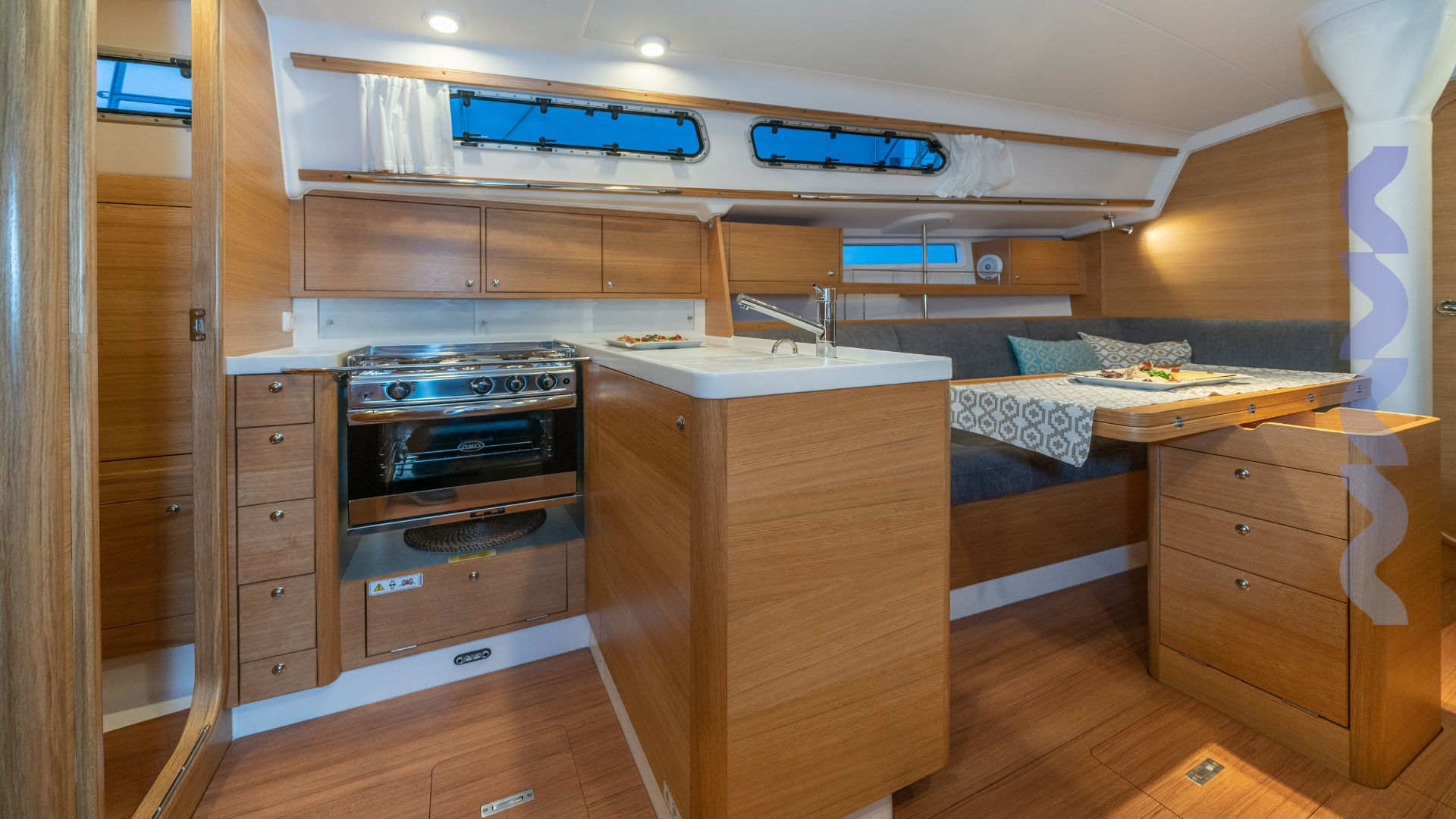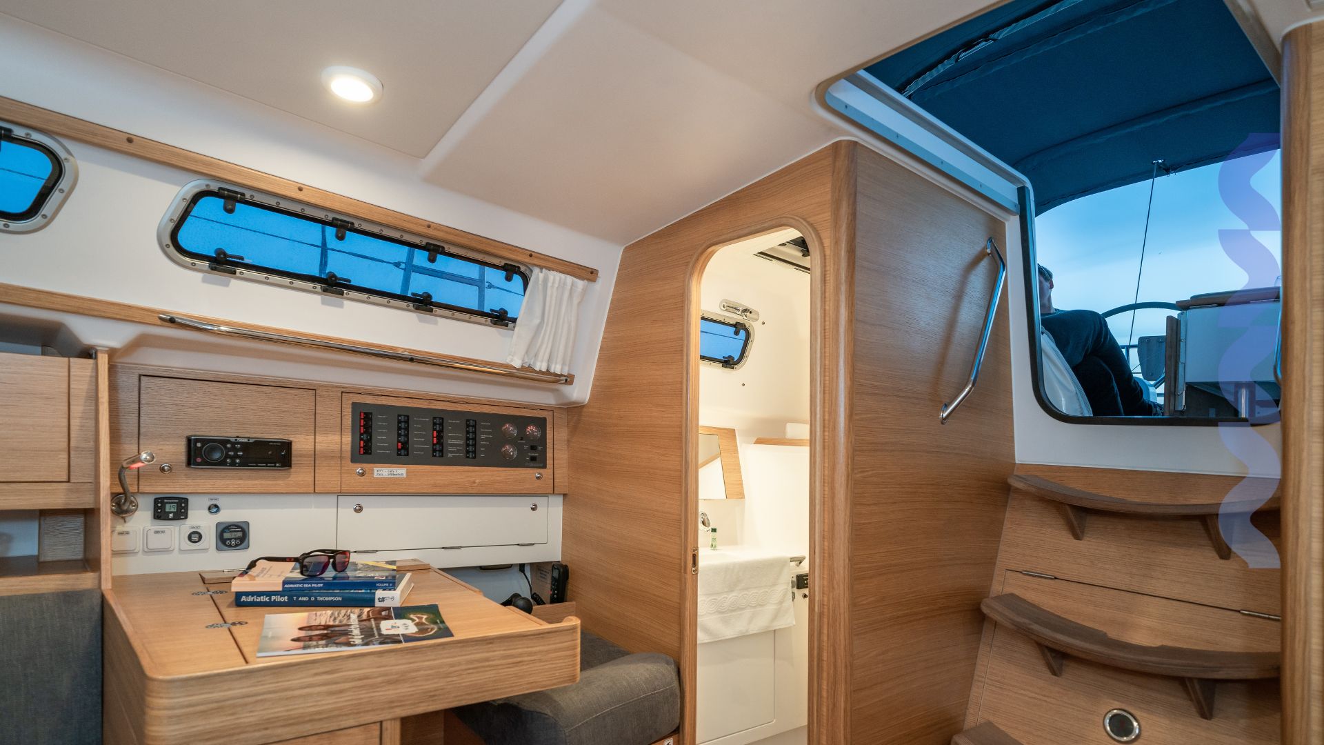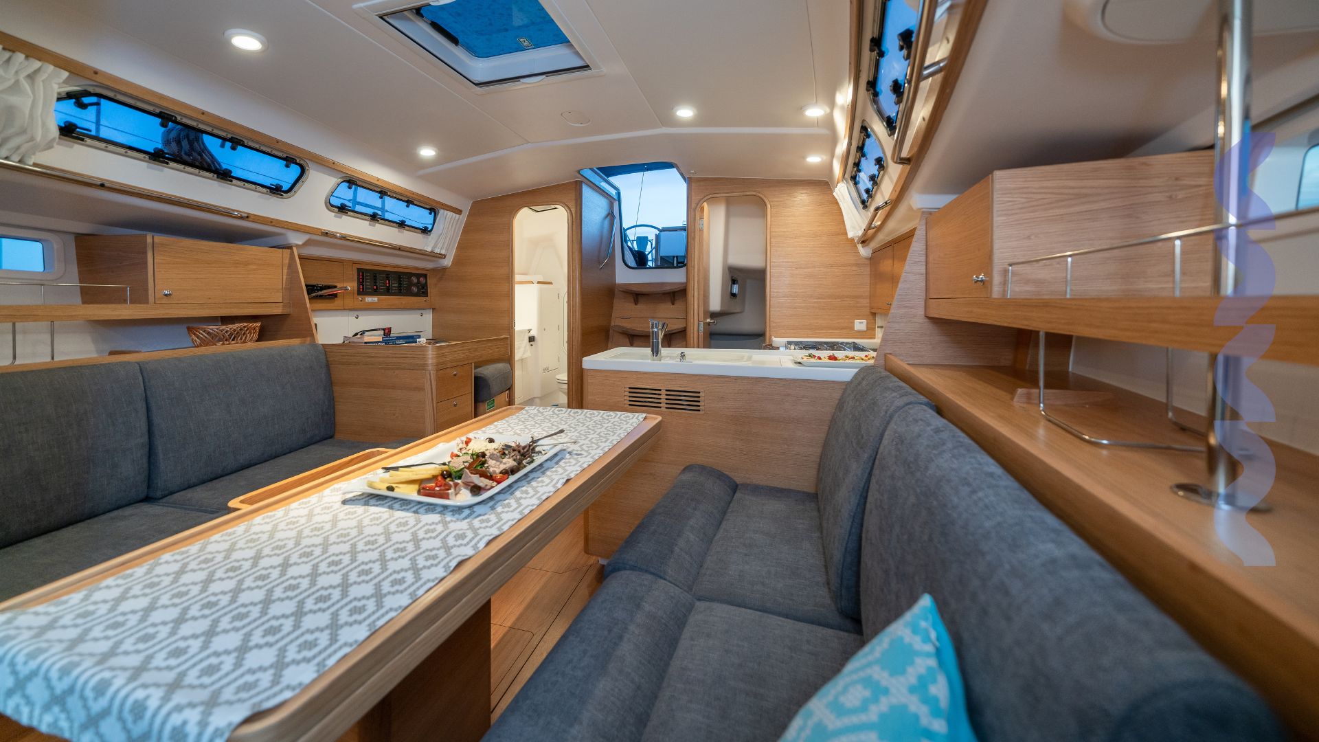 On deck, you’ll find a teak cockpit, cushions, bimini, sprayhood, bathing platform, and bow thruster. Comfort is enhanced with heating, water heater, fridge, oven, Fusion sound system, and Wi-Fi.