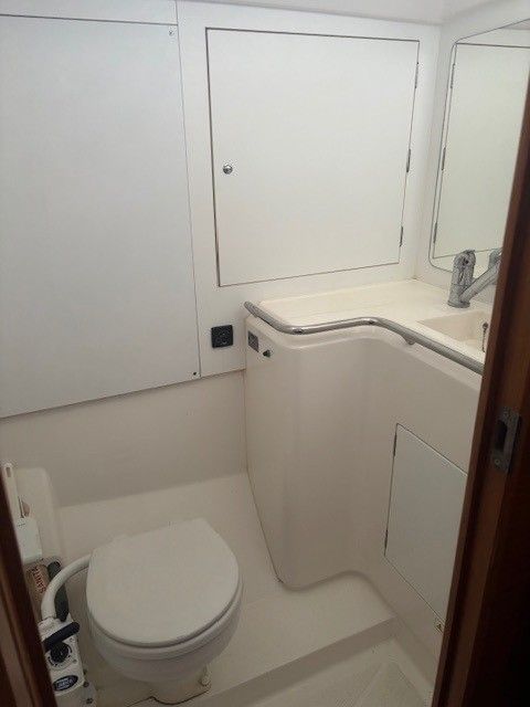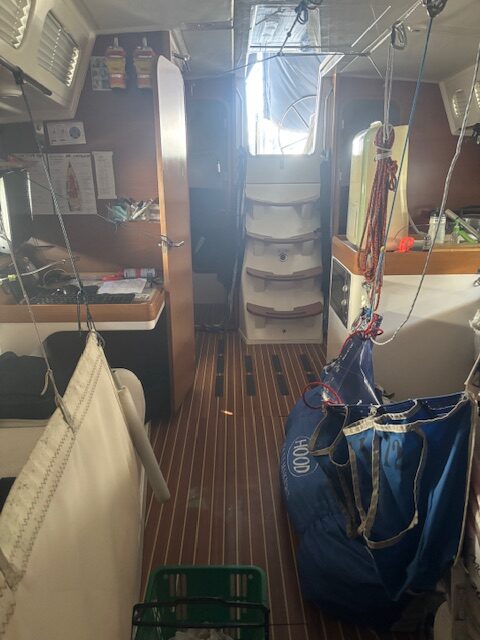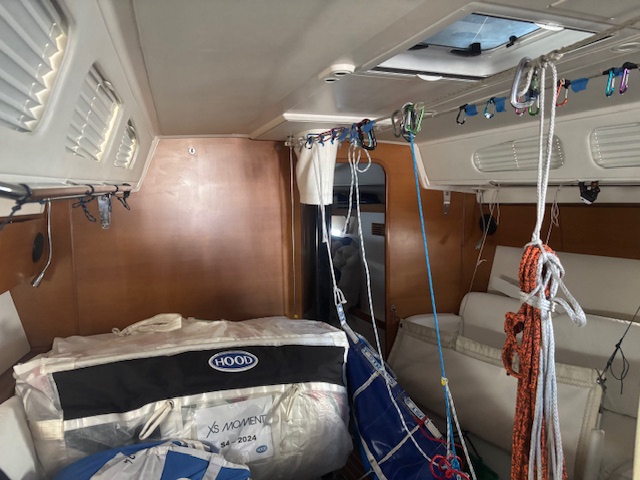 XS Moment has an excellent set of racing sails from Hood and many cruising and delivery sails, a Axom carbon mast and boom and new rudder. Internally she is pristine with covers over her Alicante leather upholstery