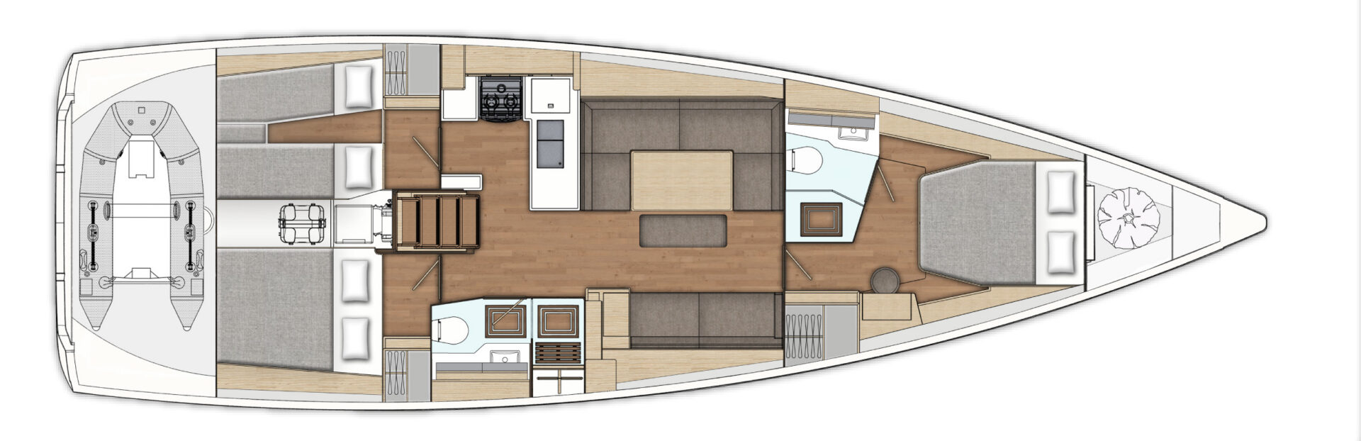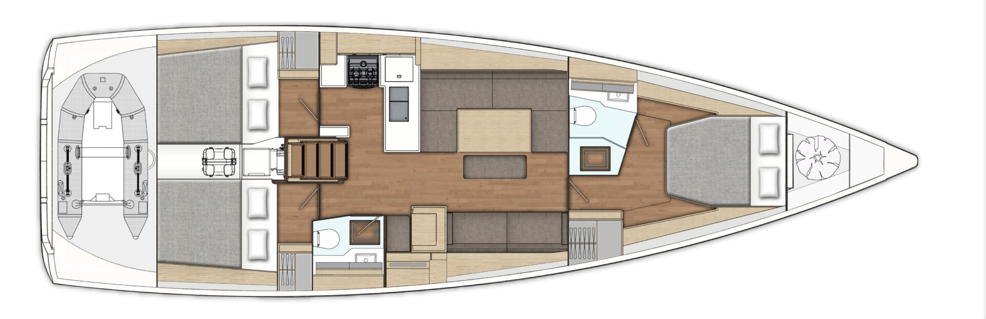 The cockpit layout can also be customised to include a removable teak table with hinged leaves.