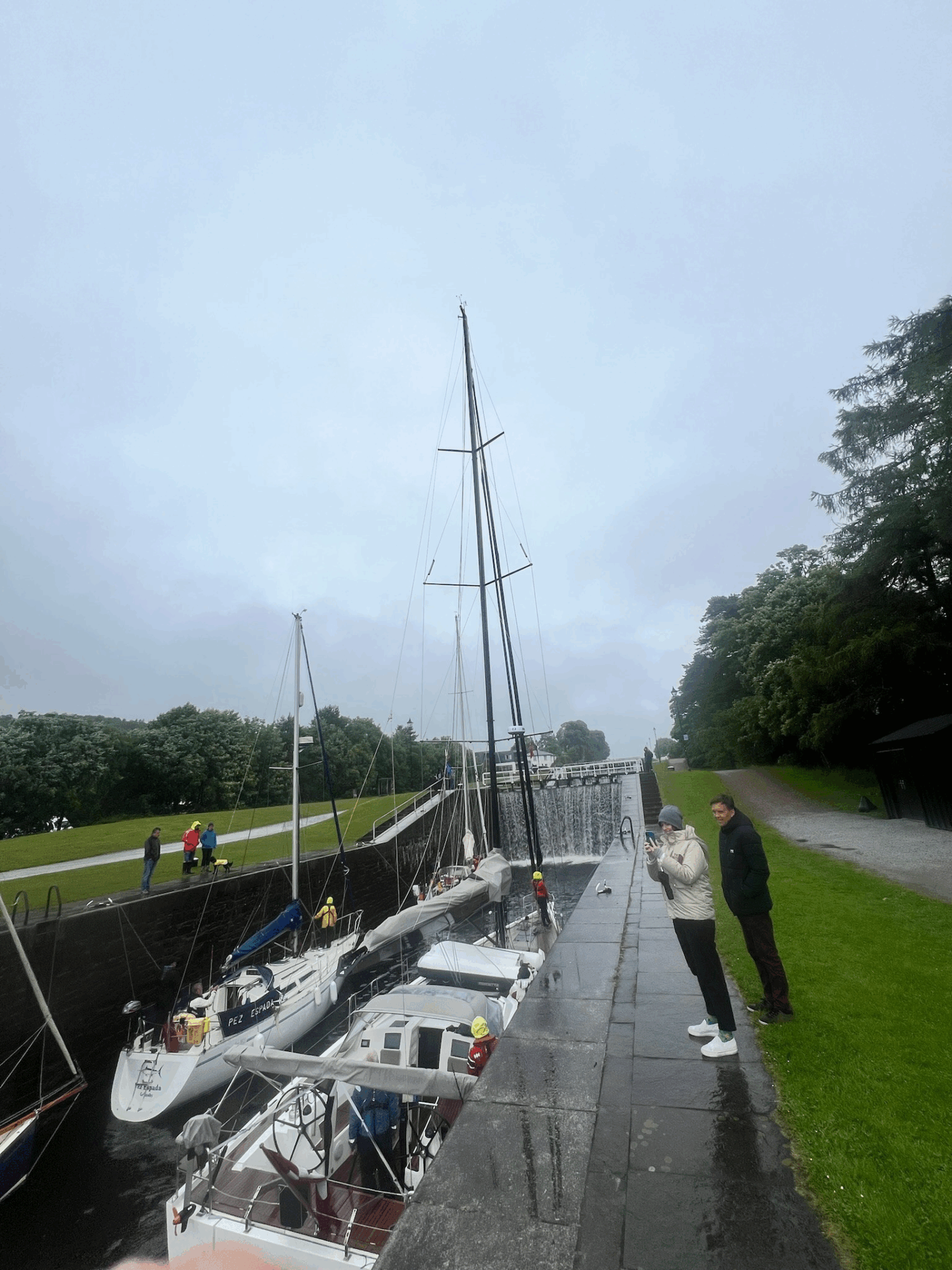 From the Azores, the route led through Ireland, Scotland, and into the Caledonian Canal—an entirely different kind of sailing. Lock navigation quickly made them the center of tourist attention; crowds gathered at every lock, taking photos and videos as the Xc 47 rose and descended. Sailing across lakes like the iconic Loch Ness, surrounded by towering mountains and 200 meters of water below the keel, felt almost surreal.
